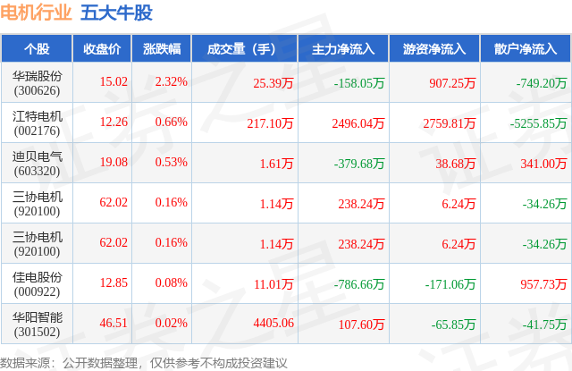 个股表现方面,电机行业当日领涨股为华瑞股份(300626),该股当日报收15.02,上涨2.32%,成交量25.39万,主力资金净流出158.05万元。江特电机(002176)以上涨0.66%紧随其后,该股当日成交量217.1万,主力资金净流入2496.04万元。除此之外,迪贝电气(603320)、三协电机(920100)、三协电机(920100)均进入当日牛股之列。具体个股列表见下表: