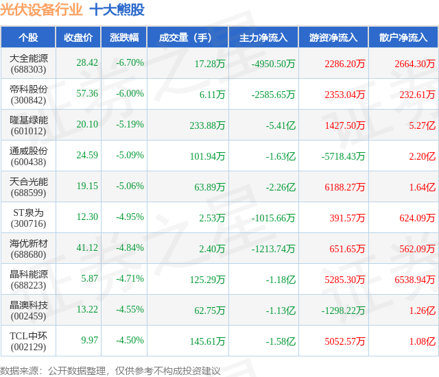 个股表现方面,光伏设备行业当日领跌股为大全能源(688303),该股当日报收28.42,下跌6.7%,成交量17.28万,主力资金净流出4950.5万元。帝科股份(300842)以下跌6.0%紧随其后,该股当日成交量6.11万,主力资金净流出2585.65万元。除此之外,隆基绿能(601012)、通威股份(600438)、天合光能(688599)均进入当日熊股之列。具体个股列表见下表: