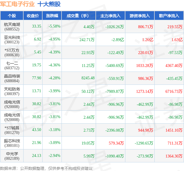 个股表现方面,军工电子行业当日领跌股为航天南湖(688552),该股当日报收33.35,下跌5.58%,成交量4.4万,主力资金净流出1026.26万元。亚光科技(300123)以下跌4.95%紧随其后,该股当日成交量242.71万,主力资金净流出2.89亿元。除此之外,*ST万方(000638)、七一二(603712)、晶品特装(688084)均进入当日熊股之列。具体个股列表见下表: