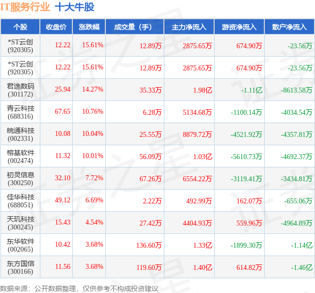个股表现方面,IT服务行业当日领涨股为*ST云创(920305),该股当日报收12.22,上涨15.61%,成交量12.89万,主力资金净流入2875.65万元。*ST云创(920305)以上涨15.61%紧随其后,该股当日成交量12.89万,主力资金净流入2875.65万元。除此之外,君逸数码(301172)、青云科技(688316)、皖通科技(002331)均进入当日牛股之列。具体个股列表见下表: