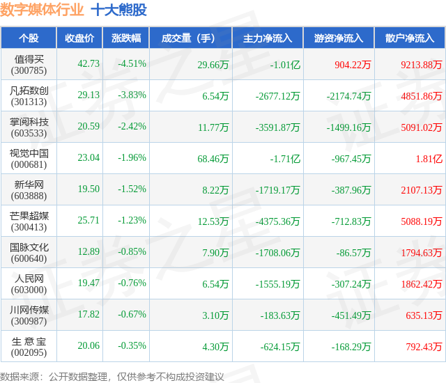 个股表现方面,数字媒体行业当日领跌股为值得买(300785),该股当日报收42.73,下跌4.51%,成交量29.66万,主力资金净流出1.01亿元。凡拓数创(301313)以下跌3.83%紧随其后,该股当日成交量6.54万,主力资金净流出2677.12万元。除此之外,掌阅科技(603533)、视觉中国(000681)、新华网(603888)均进入当日熊股之列。具体个股列表见下表: