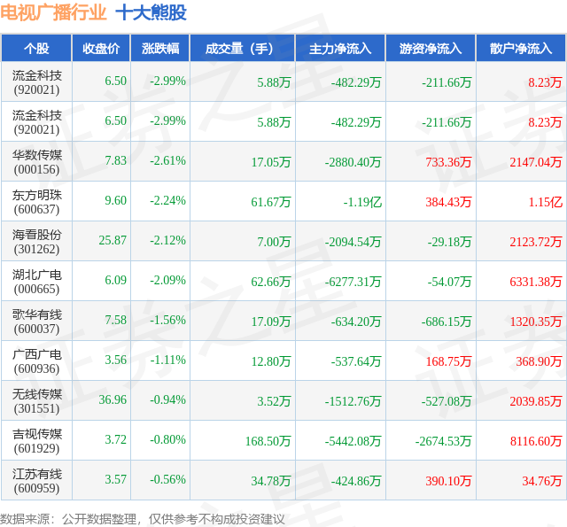 个股表现方面,电视广播行业当日领跌股为流金科技(920021),该股当日报收6.5,下跌2.99%,成交量5.88万,主力资金净流出482.29万元。流金科技(920021)以下跌2.99%紧随其后,该股当日成交量5.88万,主力资金净流出482.29万元。除此之外,华数传媒(000156)、东方明珠(600637)、海看股份(301262)均进入当日熊股之列。具体个股列表见下表: