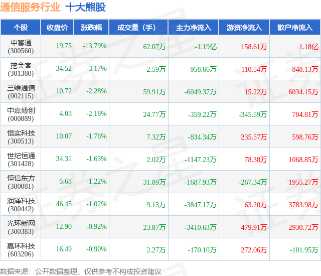 个股表现方面,通信服务行业当日领跌股为中富通(300560),该股当日报收19.75,下跌13.79%,成交量62.07万,主力资金净流出1.19亿元。挖金客(301380)以下跌3.17%紧随其后,该股当日成交量2.59万,主力资金净流出958.66万元。除此之外,三维通信(002115)、中嘉博创(000889)、恒实科技(300513)均进入当日熊股之列。具体个股列表见下表: