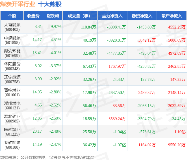 个股表现方面,煤炭开采行业当日领跌股为大有能源(600403),该股当日报收8.31,下跌9.97%,成交量110.84万,主力资金净流出3098.41万元。中煤能源(601898)以下跌4.51%紧随其后,该股当日成交量40.19万,主力资金净流出8928.81万元。除此之外,潞安环能(601699)、华阳股份(600348)、辽宁能源(600758)均进入当日熊股之列。具体个股列表见下表: