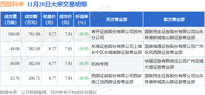 证券之星消息,11月20日西陇科学发生大宗交易,交易数据如下: