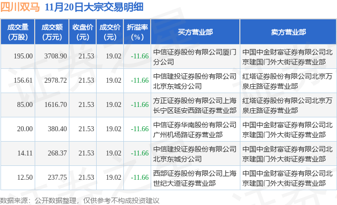 证券之星消息,11月20日四川双马发生大宗交易,交易数据如下: