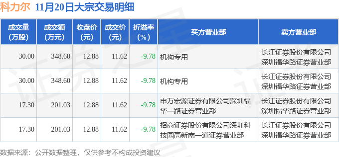 证券之星消息,11月20日科力尔发生大宗交易,交易数据如下: