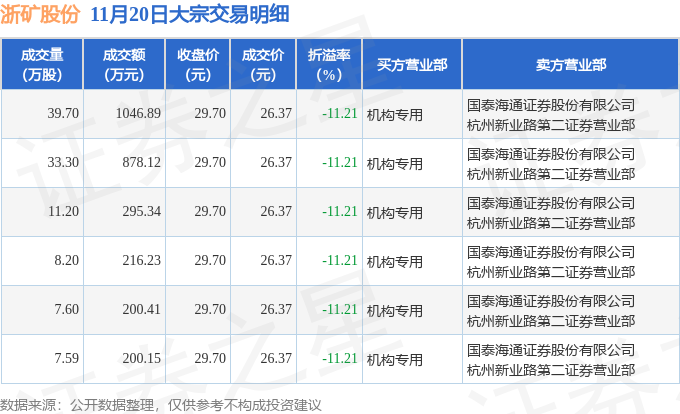 证券之星消息,11月20日浙矿股份发生大宗交易,交易数据如下:
