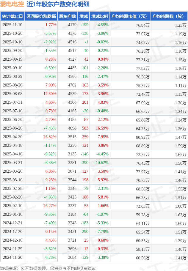 从股价来看,2025年10月20日至2025年11月10日,菱电电控区间涨幅为1.77%,在此期间股东户数减少199.0户,减幅为4.55%。