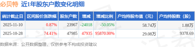 从股价来看,2025年10月28日至2025年11月10日,必贝特区间涨幅为0.87%,在此期间股东户数减少2.4万户,减幅为50.05%。