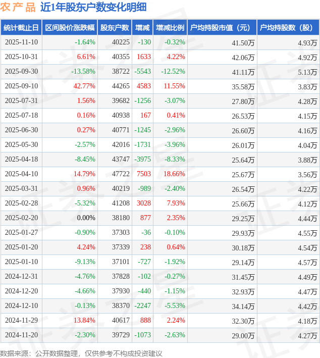从股价来看,2025年10月31日至2025年11月10日,农 产 品区间跌幅为1.64%,在此期间股东户数减少130.0户,减幅为0.32%。