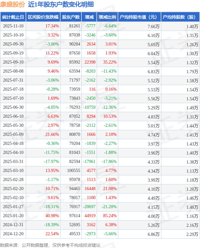 从股价来看,2025年10月10日至2025年11月10日,康盛股份区间涨幅为17.34%,在此期间股东户数减少5777.0户,减幅为6.64%。