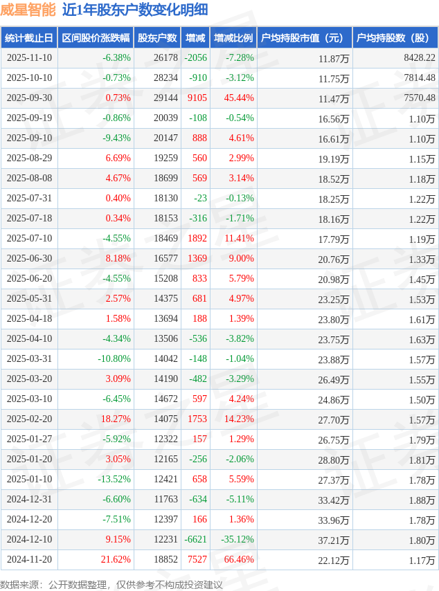 从股价来看,2025年10月10日至2025年11月10日,威星智能区间跌幅为6.38%,在此期间股东户数减少2056.0户,减幅为7.28%。
