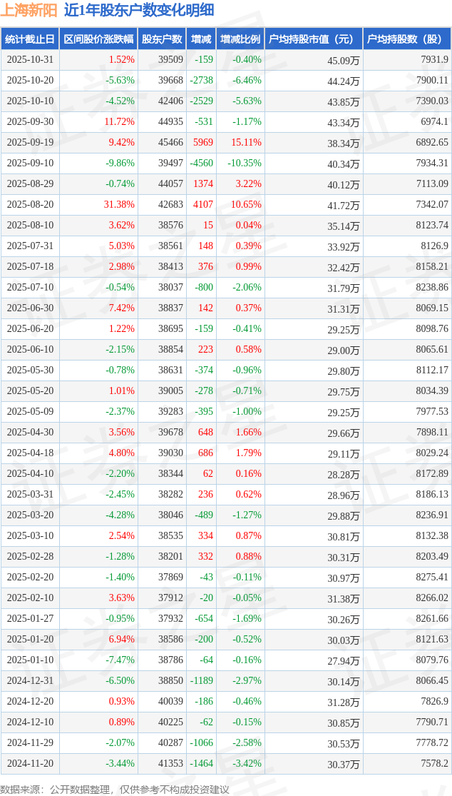 从股价来看,2025年10月20日至2025年10月31日,上海新阳区间涨幅为1.52%,在此期间股东户数减少159.0户,减幅为0.4%。
