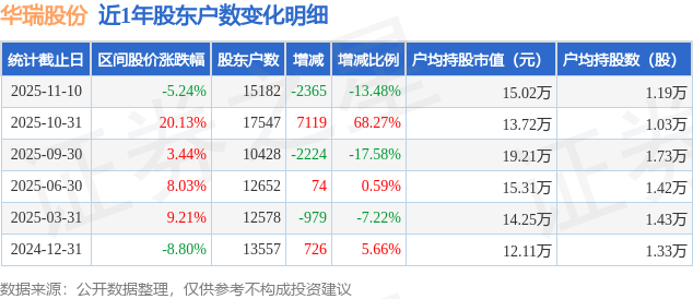 从股价来看,2025年10月31日至2025年11月10日,华瑞股份区间跌幅为5.24%,在此期间股东户数减少2365.0户,减幅为13.48%。
