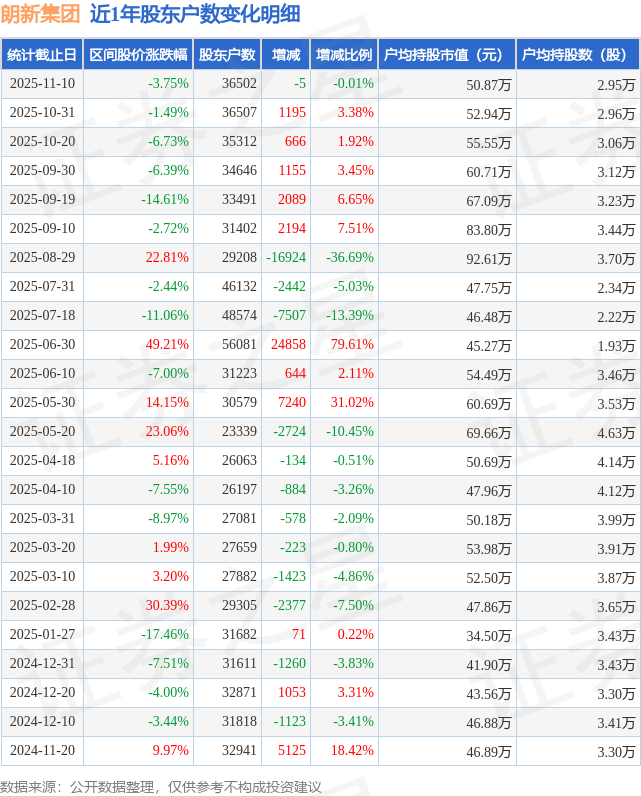 从股价来看,2025年10月31日至2025年11月10日,朗新集团区间跌幅为3.75%,在此期间股东户数减少5.0户,减幅为0.01%。