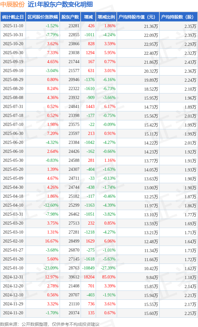 从股价来看,2025年10月31日至2025年11月10日,中辰股份区间跌幅为1.52%,在此期间股东户数增加426.0户,增幅为1.86%。