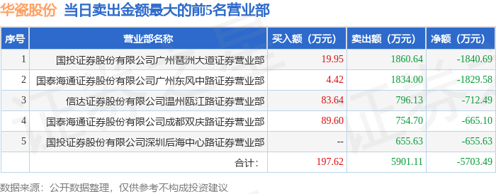 证券之星消息,沪深交易所2025年11月20日公布的交易公开信息显示,华瓷股份(001216)因日跌幅偏离值达到7%的前5只证券登上龙虎榜。此次是近5个交易日内第3次上榜。