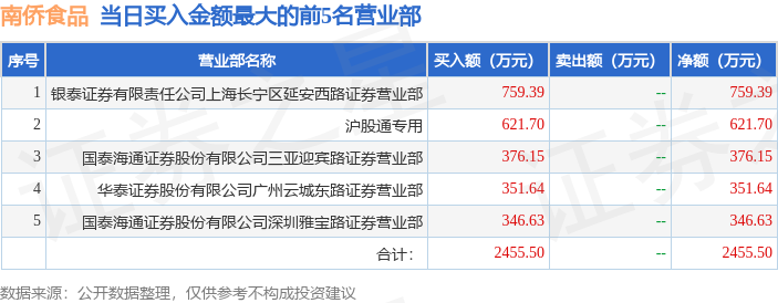 从龙虎榜公布的当日买卖数据来看,北向资金合计净买入621.7万元。佛山系、宁波桑田路、炒股养家等知名游资榜上有名。(知名游资佛山系一般指国泰海通证券股份有限公司三亚迎宾路证券营业部席位、知名游资宁波桑田路一般指国盛证券有限责任公司宁波桑田路证券营业部席位、知名游资炒股养家一般指华鑫证券有限责任公司上海宛平南路证券营业部席位,根据市场资料整理,仅供参考)