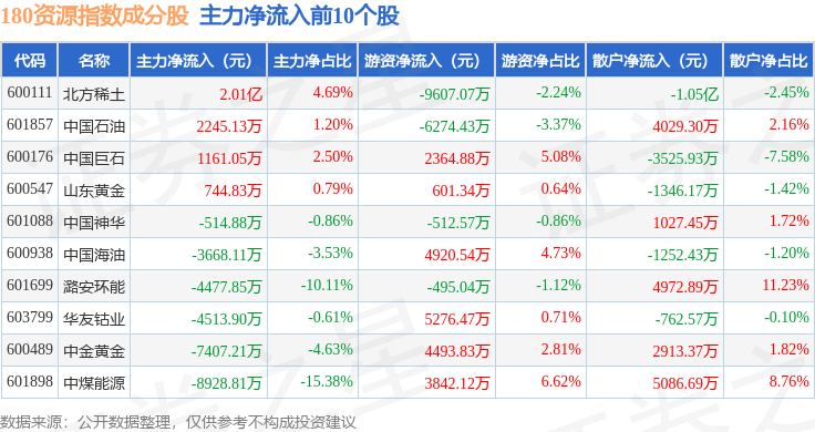 资金流向方面,180资源(000026)指数成份股当日主力资金净流出合计15.02亿元,游资资金净流入合计4.74亿元,散户资金净流入合计10.28亿元。成份股资金流向详情见下表: