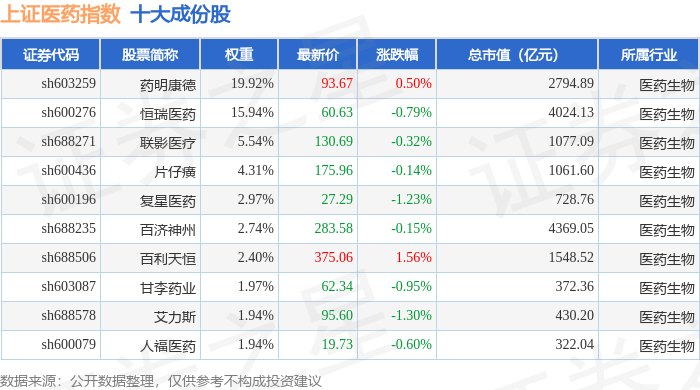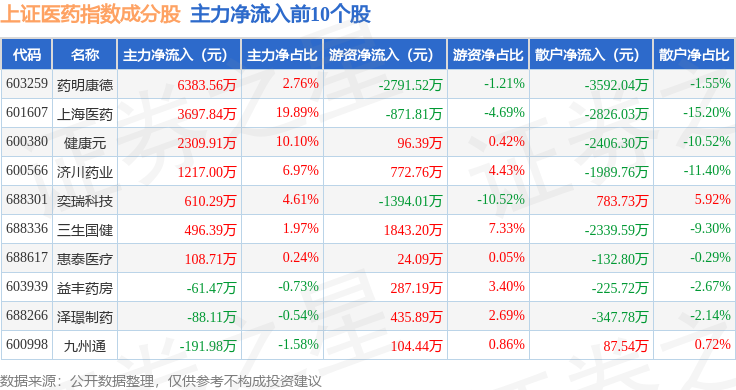 资金流向方面,上证医药(000037)指数成份股当日主力资金净流出合计9.05亿元,游资资金净流入合计1.62亿元,散户资金净流入合计7.42亿元。成份股资金流向详情见下表: