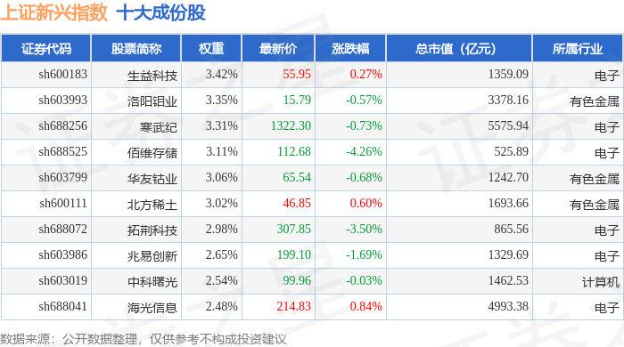 证券之星消息,11月20日,上证新兴(000067)指数报收于8615.65点,跌1.06%,成交892.76亿元,换手率1.01%。当日该指数成份股中,上涨的有15家,恒立液压以2.56%的涨幅领涨,下跌的有34家,隆基绿能以5.19%的跌幅领跌。
