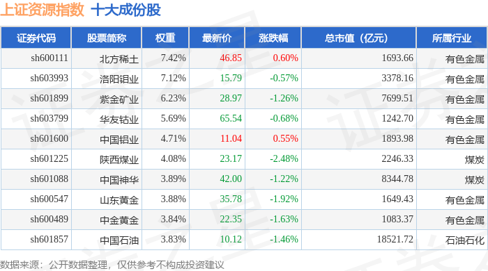 上证资源(000068)指数十大成份股详情如下: