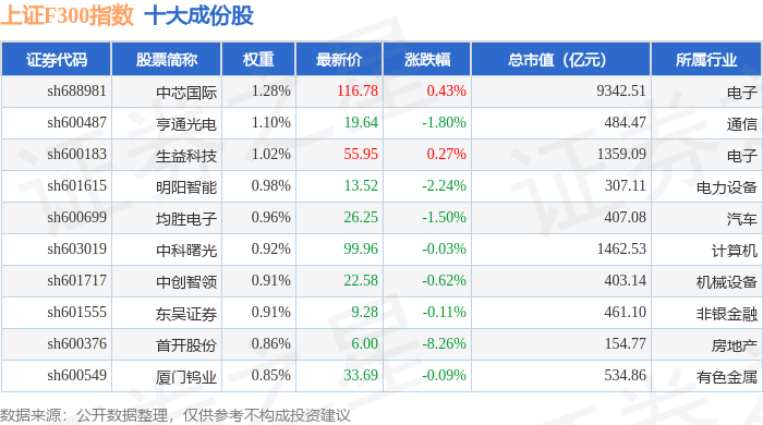 证券之星消息,11月20日,上证F300(000099)指数报收于8981.82点,跌0.86%,成交1179.94亿元,换手率1.21%。当日该指数成份股中,上涨的有79家,贵研铂业以5.02%的涨幅领涨,下跌的有202家,首开股份以8.26%的跌幅领跌。
