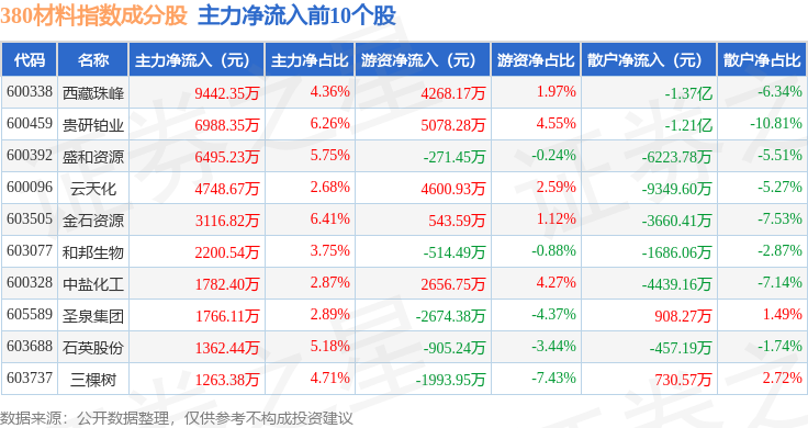 资金流向方面,380材料(000105)指数成份股当日主力资金净流出合计7.49亿元,游资资金净流入合计2.23亿元,散户资金净流入合计5.27亿元。成份股资金流向详情见下表: