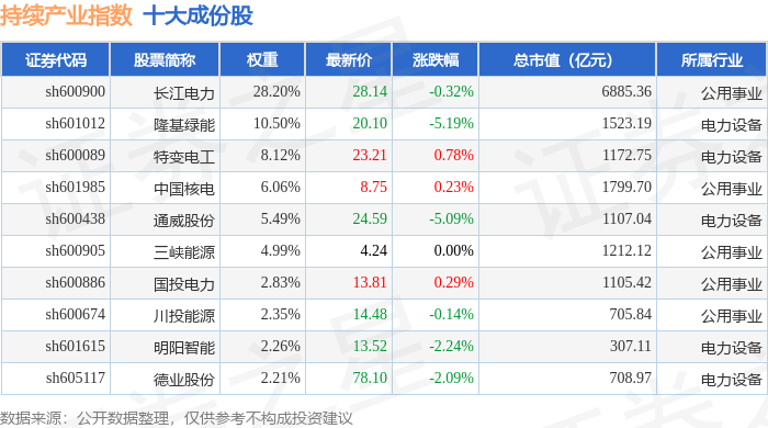 证券之星消息,11月20日,持续产业(000114)指数报收于1287.82点,跌1.52%,成交287.61亿元,换手率0.94%。当日该指数成份股中,上涨的有7家,特变电工以0.78%的涨幅领涨,下跌的有30家,大全能源以6.7%的跌幅领跌。
