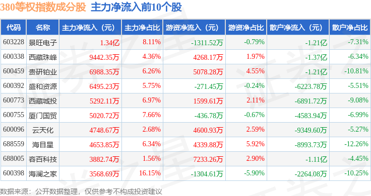 资金流向方面,380等权(000115)指数成份股当日主力资金净流出合计70.65亿元,游资资金净流入合计18.2亿元,散户资金净流入合计52.46亿元。成份股资金流向详情见下表: