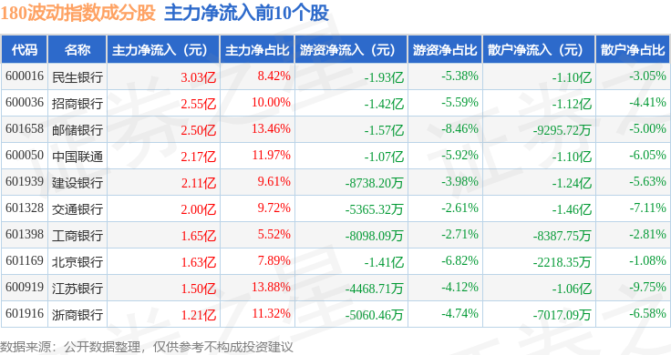 资金流向方面,180波动(000129)指数成份股当日主力资金净流入合计7.48亿元,游资资金净流出合计8.38亿元,散户资金净流入合计9039.77万元。成份股资金流向详情见下表: