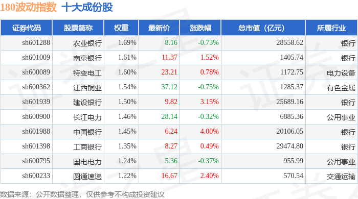 证券之星消息,11月20日,180波动(000129)指数报收于15515.2点,跌0.08%,成交998.17亿元,换手率0.43%。当日该指数成份股中,上涨的有45家,中国银行以4.0%的涨幅领涨,下跌的有48家,中煤能源以4.51%的跌幅领跌。