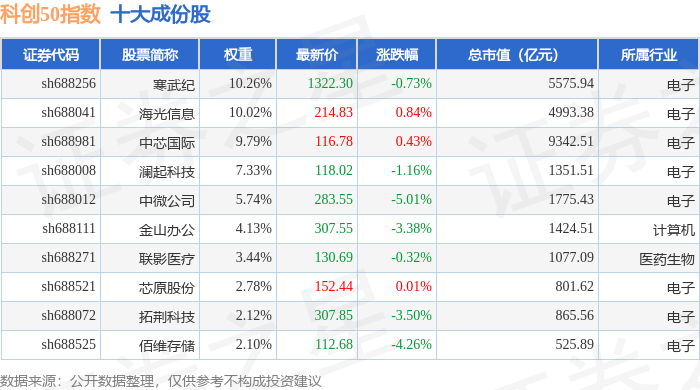 证券之星消息,11月20日,科创50(000688)指数报收于1328.19点,跌1.24%,成交437.45亿元,换手率1.18%。当日该指数成份股中,上涨的有10家,天岳先进以5.77%的涨幅领涨,下跌的有40家,大全能源以6.7%的跌幅领跌。