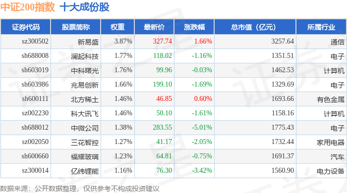 证券之星消息,11月20日,中证200(000904)指数报收于5491.22点,跌0.56%,成交2133.79亿元,换手率1.1%。当日该指数成份股中,上涨的有57家,北新建材以5.69%的涨幅领涨,下跌的有136家,大全能源以6.7%的跌幅领跌。