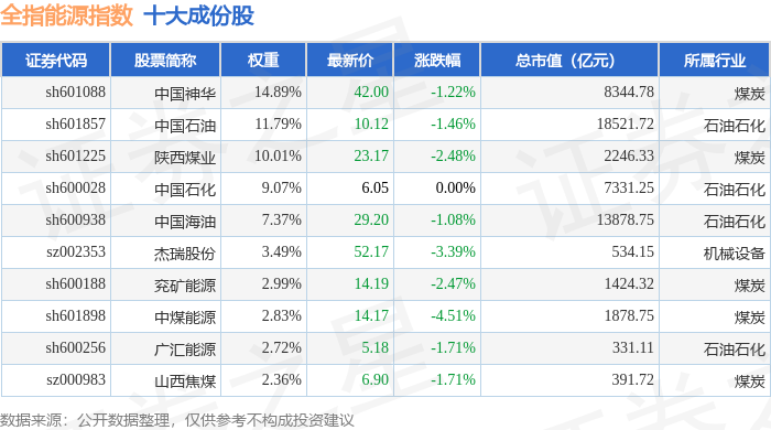 资金流向方面,全指能源(000986)指数成份股当日主力资金净流出合计11.43亿元,游资资金净流入合计1.51亿元,散户资金净流入合计9.92亿元。成份股资金流向详情见下表: