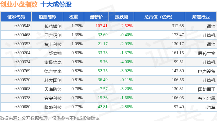 证券之星消息,11月20日,创业小盘(399020)指数报收于1694.96点,跌0.72%,成交756.49亿元,换手率4.18%。当日该指数成份股中,上涨的有85家,中富电路以20.0%的涨幅领涨,下跌的有212家,中富通以13.79%的跌幅领跌。