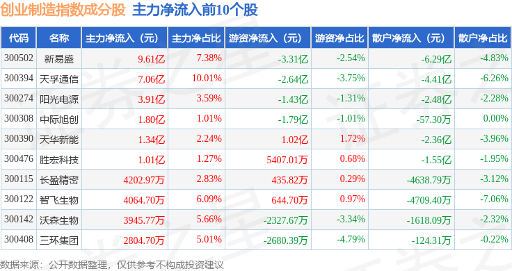 资金流向方面,创业制造(399261)指数成份股当日主力资金净流出合计14.38亿元,游资资金净流出合计3.99亿元,散户资金净流入合计18.36亿元。成份股资金流向详情见下表: