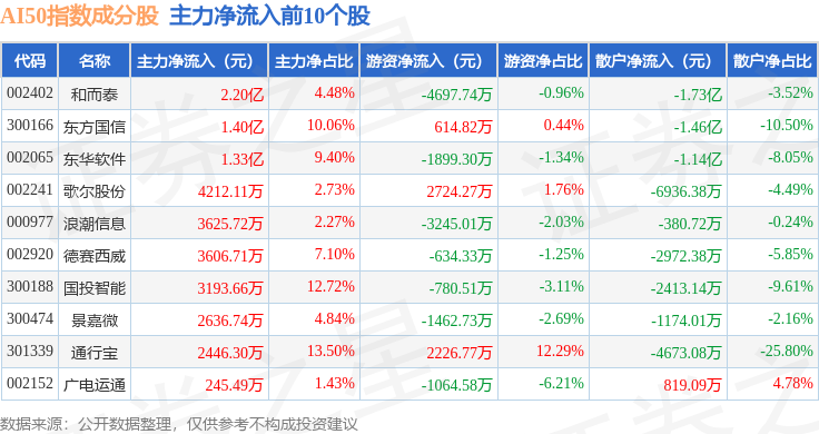 资金流向方面,AI50(399284)指数成份股当日主力资金净流出合计13.56亿元,游资资金净流入合计9940.96万元,散户资金净流入合计12.57亿元。成份股资金流向详情见下表: