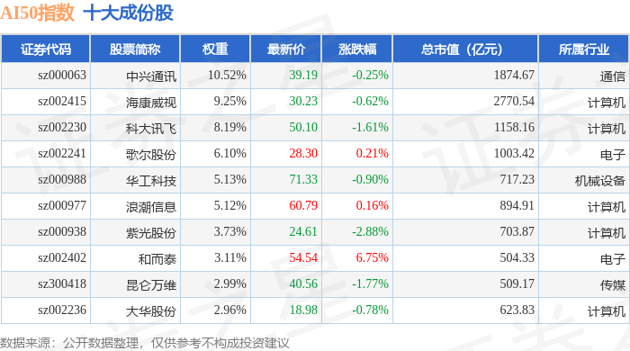 AI50(399284)指数十大成份股详情如下: