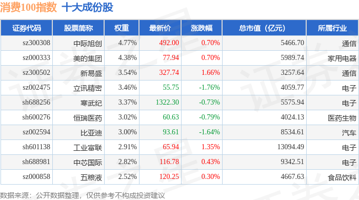 消费100(399364)指数十大成份股详情如下:
