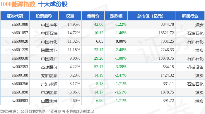 资金流向方面,1000能源(399381)指数成份股当日主力资金净流出合计9.36亿元,游资资金净流入合计1.55亿元,散户资金净流入合计7.8亿元。成份股资金流向详情见下表: