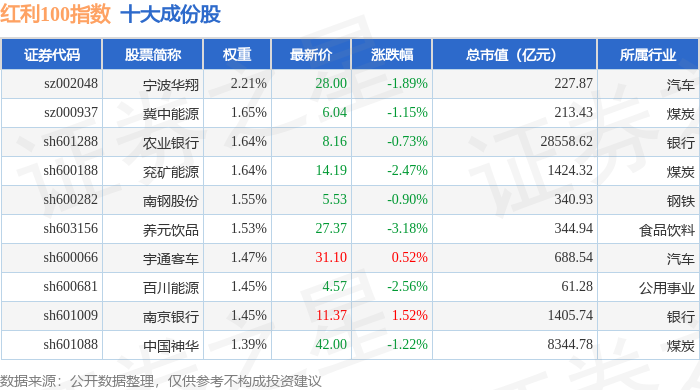 证券之星消息,11月20日,红利100(399411)指数报收于3575.02点,跌0.21%,成交514.26亿元,换手率0.46%。当日该指数成份股中,上涨的有48家,中国银行以4.0%的涨幅领涨,下跌的有46家,潞安环能以4.01%的跌幅领跌。