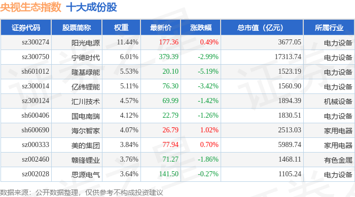 证券之星消息,11月20日,央视生态(399556)指数报收于2923.58点,跌0.98%,成交898.46亿元,换手率0.98%。当日该指数成份股中,上涨的有20家,北新建材以5.69%的涨幅领涨,下跌的有28家,隆基绿能以5.19%的跌幅领跌。