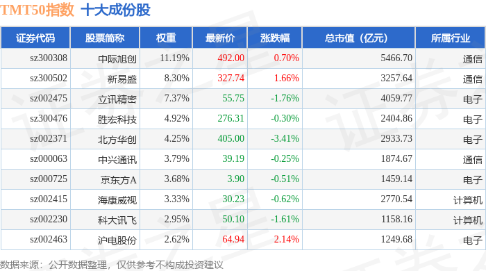证券之星消息,11月20日,TMT50(399610)指数报收于8731.85点,跌0.49%,成交1057.97亿元,换手率1.24%。当日该指数成份股中,上涨的有11家,天孚通信以4.48%的涨幅领涨,下跌的有39家,纳思达以3.81%的跌幅领跌。