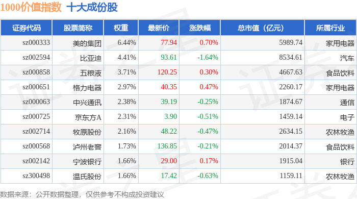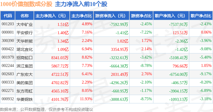 资金流向方面,1000价值(399631)指数成份股当日主力资金净流出合计46.73亿元,游资资金净流入合计7.3亿元,散户资金净流入合计39.44亿元。成份股资金流向详情见下表: