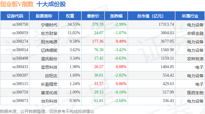 创业板V(399668)指数十大成份股详情如下: