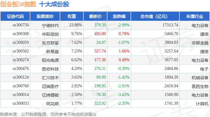 证券之星消息,11月20日,创业板50(399673)指数报收于3204.45点,跌1.15%,成交1266.16亿元,换手率2.49%。当日该指数成份股中,上涨的有11家,天孚通信以4.48%的涨幅领涨,下跌的有39家,蓝色光标以4.21%的跌幅领跌。