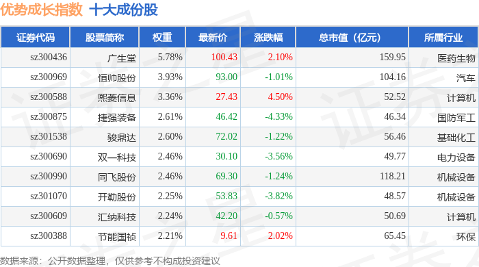 优势成长(399698)指数十大成份股详情如下: