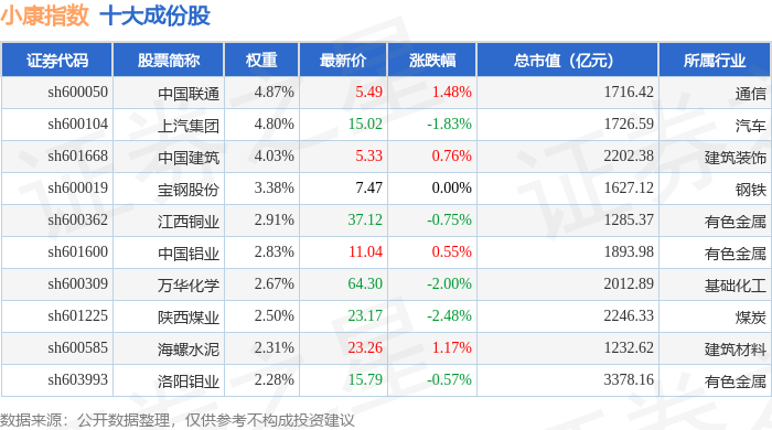 证券之星消息,11月20日,小康指数(399901)报收于6359.02点,跌0.27%,成交1053.52亿元,换手率0.76%。当日该指数成份股中,上涨的有43家,建设银行以3.15%的涨幅领涨,下跌的有48家,大全能源以6.7%的跌幅领跌。